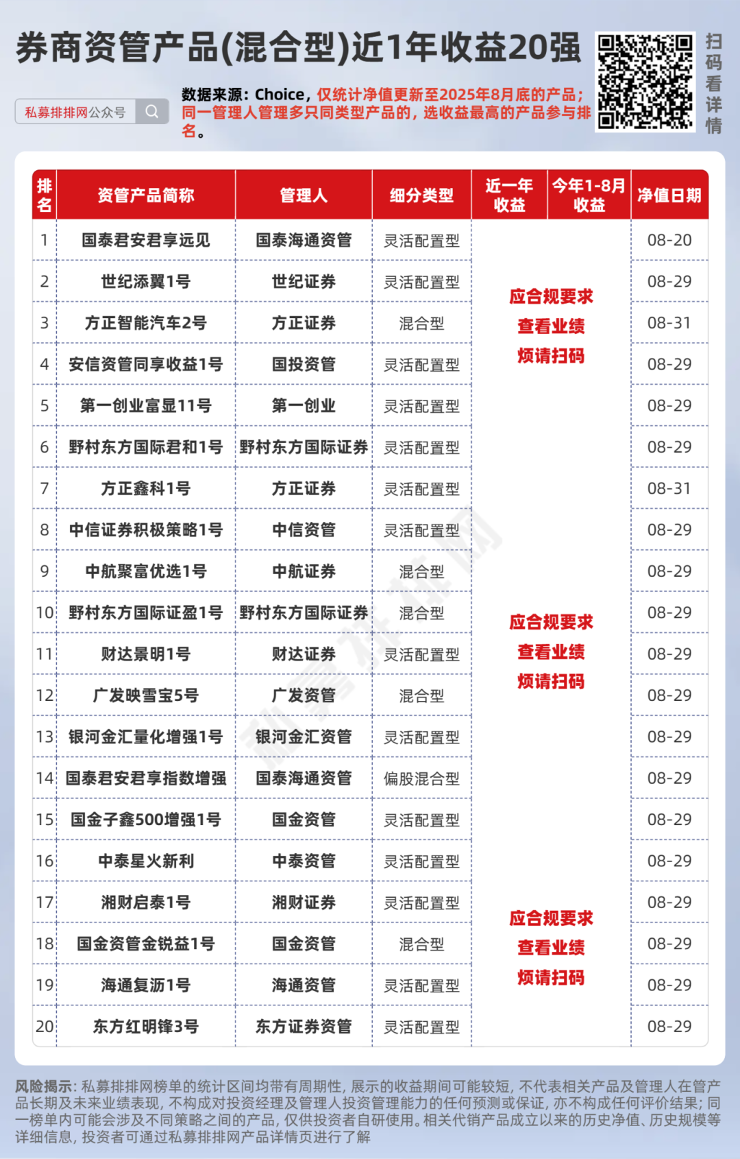 为了给读者提供一些参考,笔者区分梳理出了市集善良度较高的羼杂型、股票型、FOF和债券型券商资管居品近一年收益排名居前20或10的居品。(吞并公司管束多只相同细分类型居品的,仅选拔收益最高的居品参与排名)