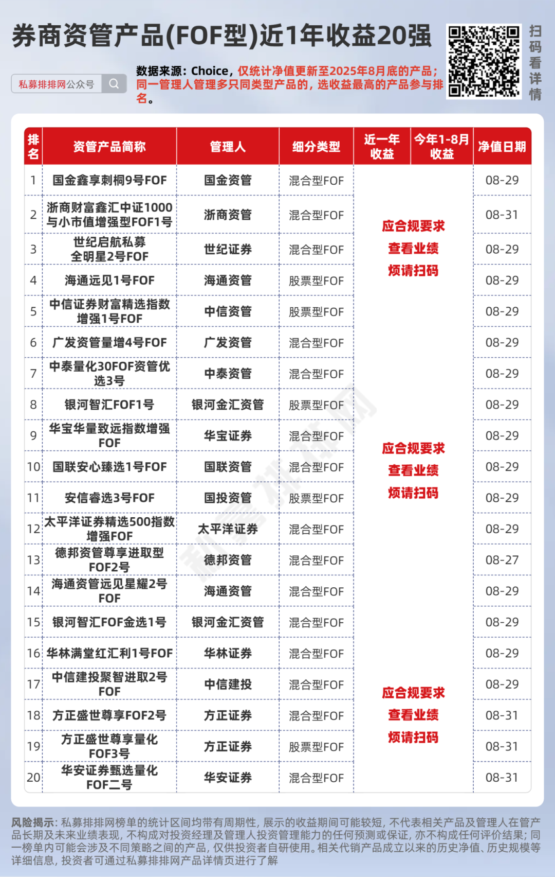 FOF类券商资管居品近一年收益前5强范例:国金鑫享刺桐9号FOF、浙商金钱鑫汇中证1000与小市值增强型FOF1号、世纪启程私募全明星2号FOF、海通远见1号FOF、中信证券金钱精选指数增强1号FOF。