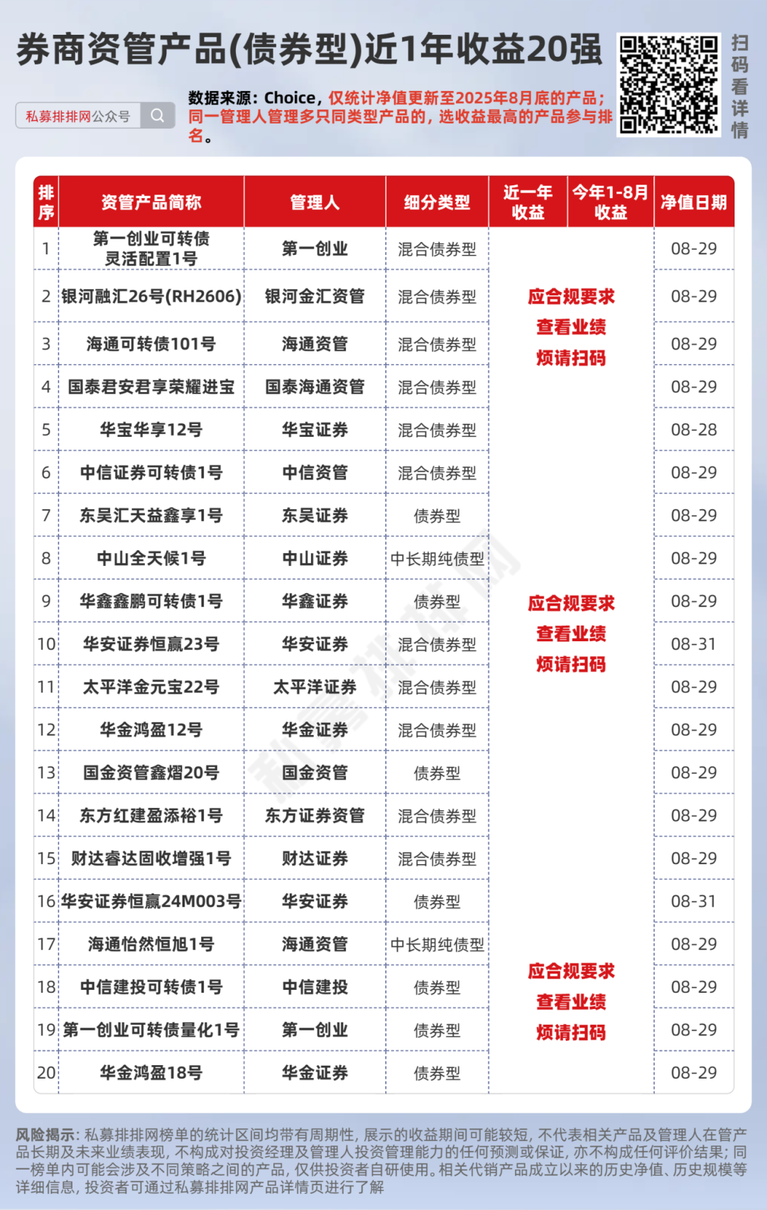 债券型券商资管居品近一年收益前5强范例是:第一创业可转债生动配置1号、星河融汇26号(RH2606)、海通可转债101号、国泰君安君享荣耀进宝、华宝华享12号。