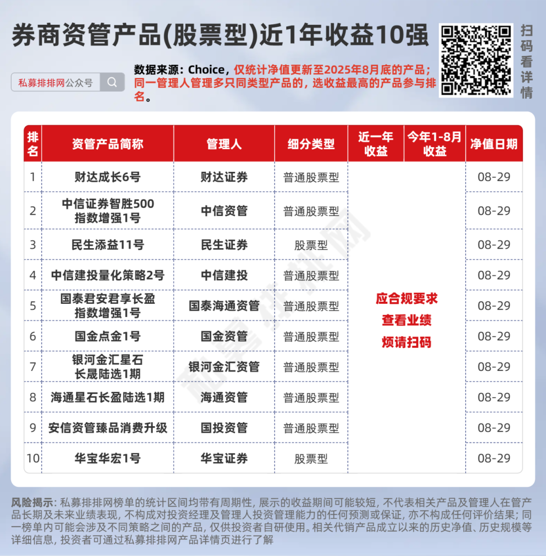 股票型券商资管居品近一年收益前3强范例是:财已毕长6号、中信证券智胜500指数增强1号、民生添益11号。