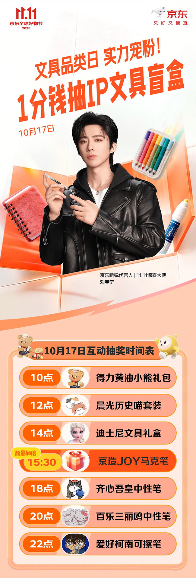 开云kaiyun官方网站 京东11.11已精采汜博开启,10月17日京东文具品类日同步进行,本次京东联袂京东新锐代言东说念主兼11.11惊喜大使刘宇宁,共同打造主题行动“在宁的文具城堡”,为粉丝带来一场兼具实用性与好奇性的文具选购盛宴,以多重福利带来文具选购新体验。逐日下昼3点半,上京东搜索“文具3点半”,即可参与1分钱抽热点IP联名款文具盲盒行动,还能享受“下学补贴”10%优惠。此外,行动本领超多爆款文具直降3折起,前卫办公新风俗系列文具低至5折,全品类文具均搭配专属福利,岂论是学习、办公依